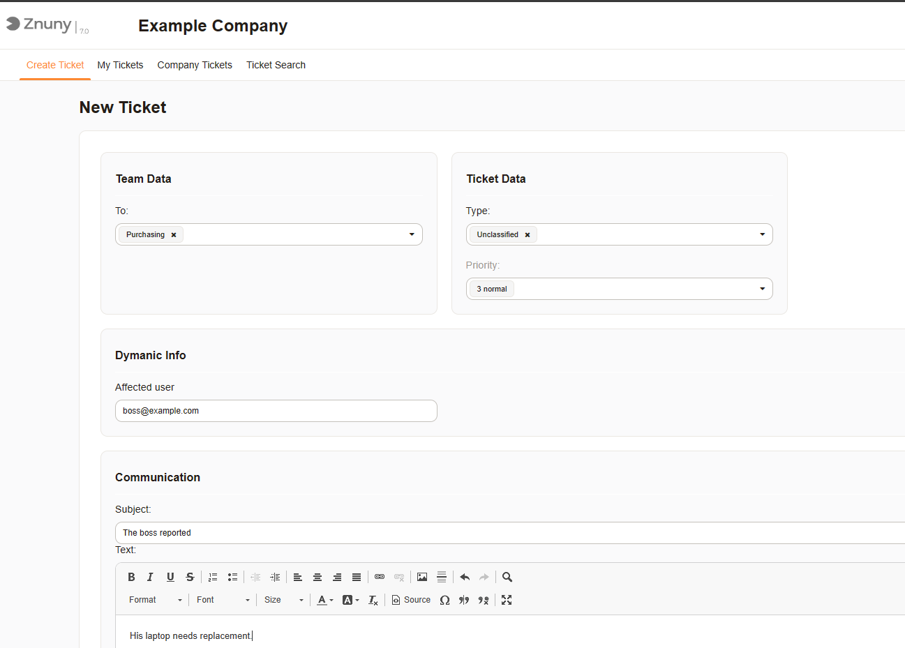 Customer Portal - The administrator will create an additional dynamic field to accept the affected user's email address. (With a special add-on from Znuny GmbH, this field can directly connect to the customer user database; this keeps errors to a minimum.)