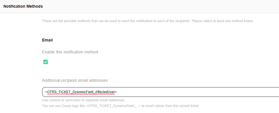 The software now has enough information to add this dynamic field information to the notification system. This allows the notification system to not only send notifications to the customer of the ticket but, in special cases, also to the service requester of a ticket that has been delegated.