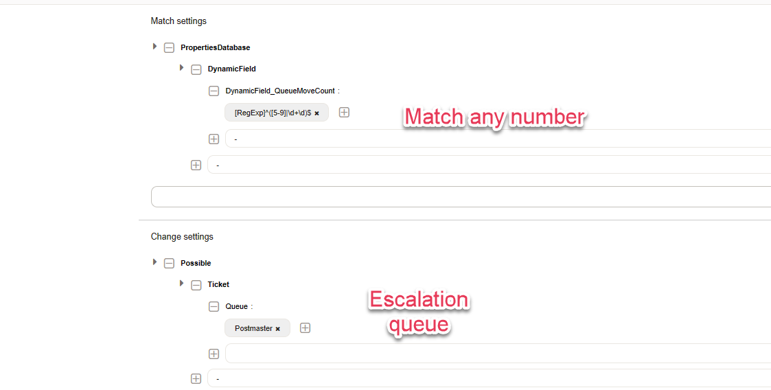 A counter was increased by every queue move, which we will now assess with an ACL, and limit the queue selection possibility as soon as it's been moved more than four times. The screenshot shows the settings required to restrict a queue based on a regular expression.