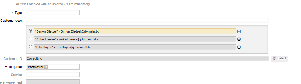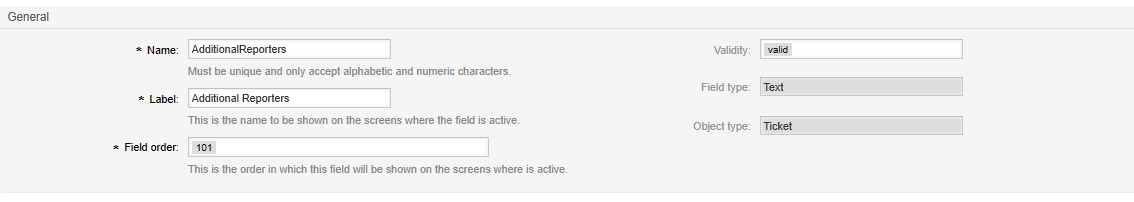This is not possible in the customer selection field for processes. Therefore, we can create a dynamic field to house a comma-separated text string for use when creating the initial article. Start by creating a dynamic field of ObjectType: Ticket and FieldType: Text.