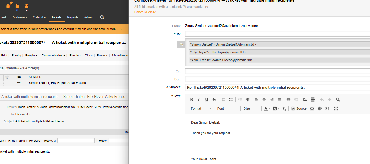 Here’s an example of how opening up a ticket with multiple recipients for the initial reporter can work in practice: