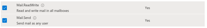 Click Application permissions. Select Mail > Mail.ReadWrite and Mail.Send. The result is the following: