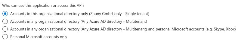 Choose an appropriate account type. Usually, "Accounts in this organizational directory only ([your company name] only - Single tenant)" is the right one. You find a more detailed explanation on the Microsoft website.