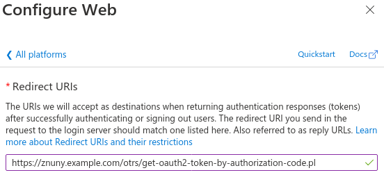 In the next screen, enter the redirect URL. This is like HttpType://FQDN/ScriptAlias/get-oauth2-token-by-authorization-code.pl, for example https://znuny.example.com/otrs/get-oauth2-token-by-authorization-code.pl